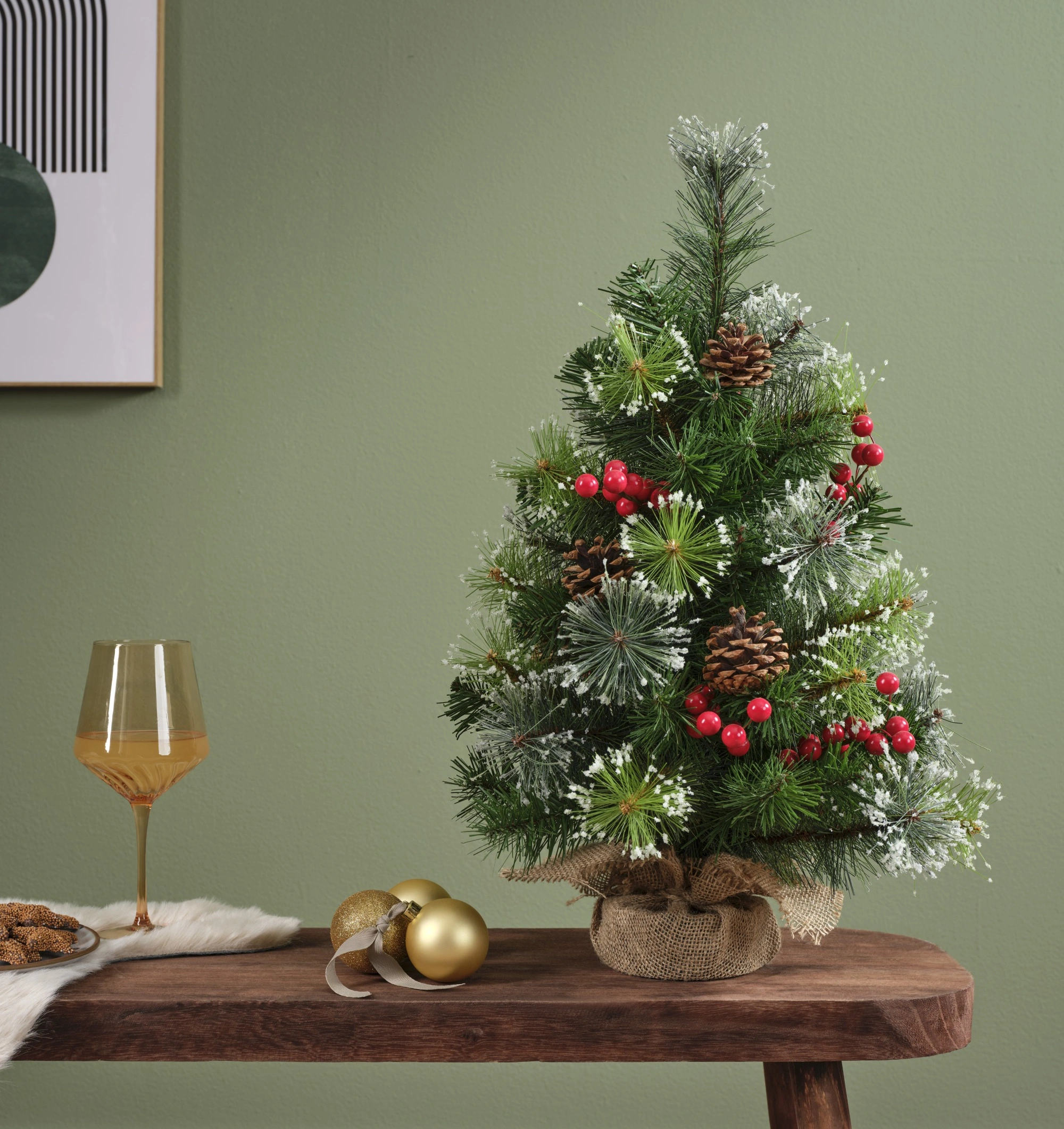 Μίνι δεντρο με χιονισμένα μούρα και κουκουνάρια εσωτερικού χώρου