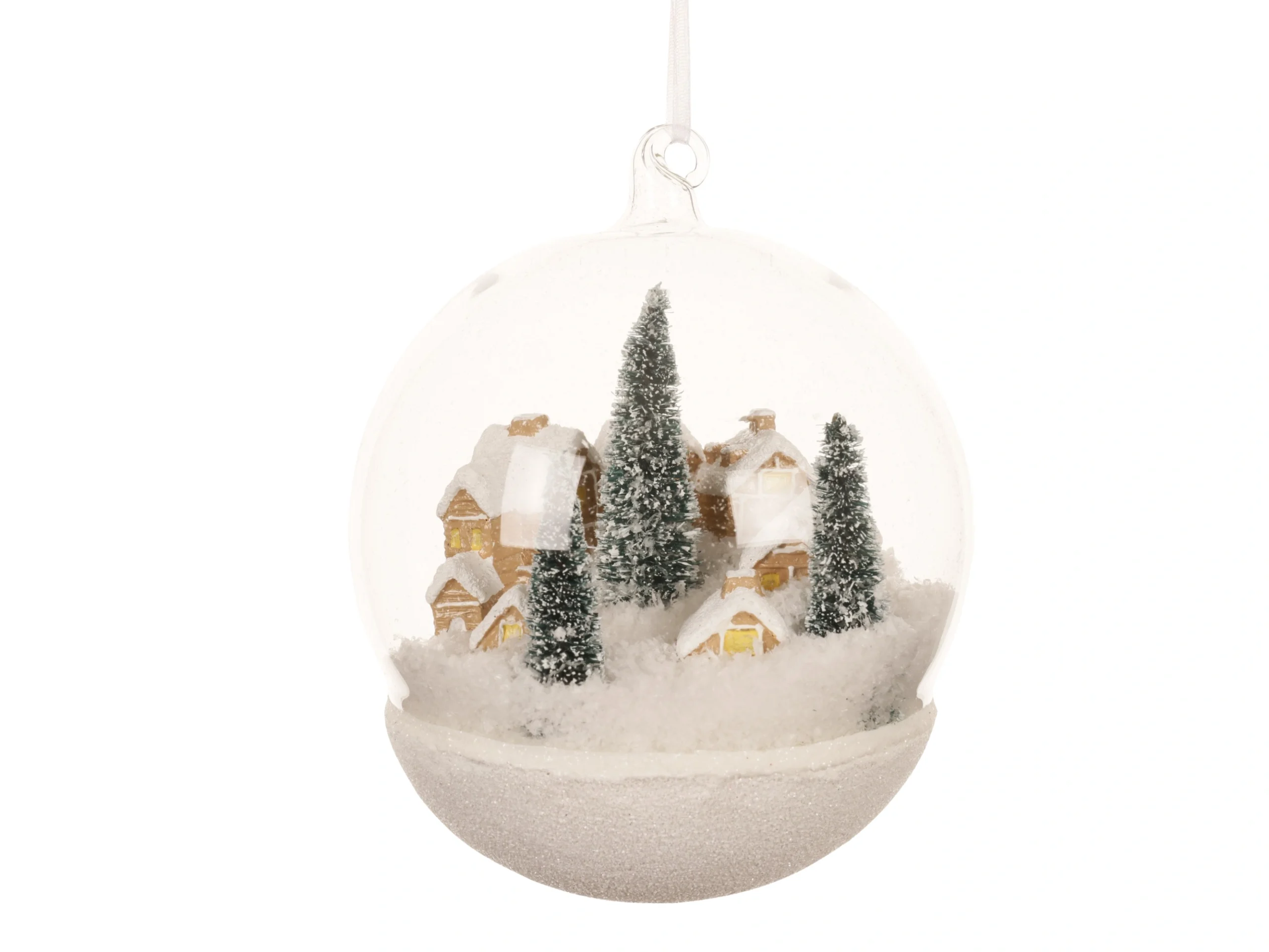 Χειροποίητο διαφανές γυάλινο στολίδι, χιονισμένο χωριό